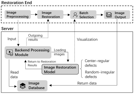 The system architecture consists of two components: the restoration end and the server (Figure 8). The restoration end directly interacts with professional restorers and automatically records the operation process, which contains the image restoration model and image database, to accomplish image restoration tasks. The image restoration model includes 15 generators for the two damage restoration methods described in Section 4.3, and the image database includes the original Dunhuang fresco images and images used in the model training.