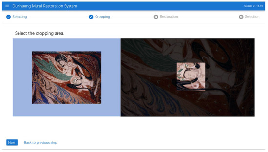 The mural image is uploaded to the restoration end and is then passed to the image-cropping page. The shape of the cropping box is limited to a square, and the user can select either automatic or manual cropping (Figure 9). The cropped image is fixed on the left side of the page to compare with the image of the restoration process.