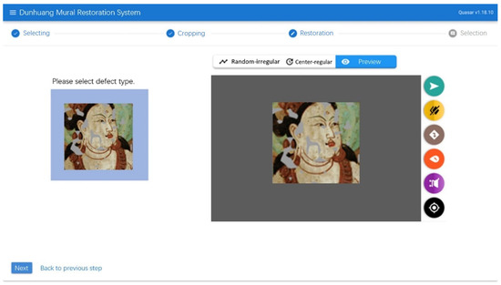 The restoration process image contains the results of 30 training rounds. The system returns 15 repaired images sequentially at an update rate of 0.5 s. The image restoration interface is shown in Figure 10. The restorer selects the type of defect in the mural and begins the restoration.