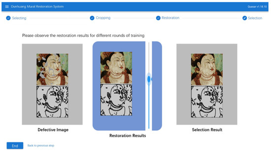After the restoration task stops, a professional can judge the restoration results of different rounds to select the image with the best restoration round (Figure 11). The selection interface is divided into two rows and three columns, displaying a total of six images. The first row, from left to right, shows the defective image, the restoration result image, and the selection result image. The second row shows the corresponding contour images. By dragging the slider in the second column, restorers can observe the restoration results at different iterations, with the contour images below being refreshed accordingly. Once the restorers select the optimal iteration result, they click “End” to complete the restoration of the image.