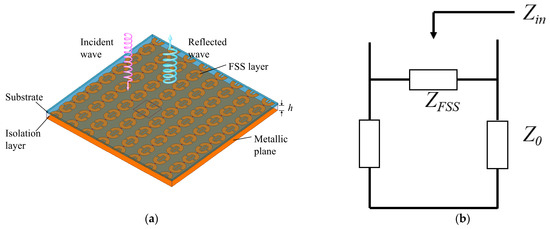 In recent years, frequency selective surfaces (FSS) have gained widespread adoption across both military and civilian sectors due to their remarkable ability to selectively transmit or block electromagnetic waves. These surfaces play a pivotal role in a variety of advanced technologies, including radar systems, antenna radomes, and space electromagnetic filters, and in the modification of absorbing materials [1,2,3,4]. In particular, the reduction in the radar cross-section (RCS) of antenna radome systems has become a critical aspect of stealth applications. This is because radome systems, which are essential for protecting antennas from external environmental factors, often scatter electromagnetic waves in unwanted directions [5]. By utilizing FSS-based radomes, it is possible to reduce RCS by reflecting electromagnetic waves outside their operating frequency band, effectively decreasing monostatic RCS [6,7,8,9]. However, this approach does have its drawbacks. The reflection of waves at certain angles can unintentionally increase bistatic RCS in other directions, creating potential vulnerabilities in stealth systems. In order to mitigate this issue, the development of frequency selective absorbers (FSA) has been proposed. Unlike FSS, these absorbers reduce bistatic RCS by absorbing out-of-band waves rather than reflecting them, making them a highly effective solution for reducing electromagnetic interference and improving overall stealth performance [10].