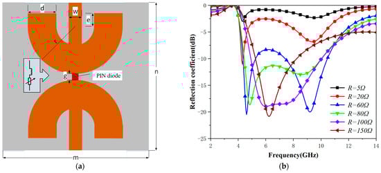 Most of the PIN diodes are used in tunable frequency selective absorbers only by changing the resistance value, so the initial design of a frequency selective surface absorber is based on variable resistance. The proposed tunable absorber unit, shown in Figure 3a, consists primarily of two symmetrical, round-headed arrow shapes with connected ends. The structure has a sandwich-like design, featuring an upper F4BM dielectric substrate layer (dielectric constant of 2.2, loss tangent of 0.0007, and thickness, t). The FSS layer, which incorporates PIN diodes, is etched onto the lower surface of the dielectric substrate. A metallic plane forms the bottom layer, with a uniform-thickness air spacer (h) positioned between the FSS layer and the metallic plane.