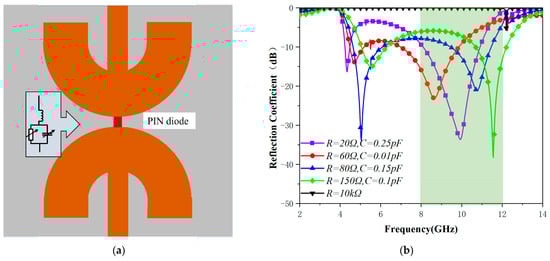 In practice, parasitic parameters—the junction capacitance inherent to the encapsulated PIN diode—have a significant impact on the performance over the entire frequency range discussed in this paper, which varies with the applied bias voltage. Therefore, based on the original design, by introducing bias-dependent variable capacitors, as shown in Figure 4a, aiming to optimize the resonant frequency control and absorption characteristics, the overall performance in frequency selective applications can be improved.