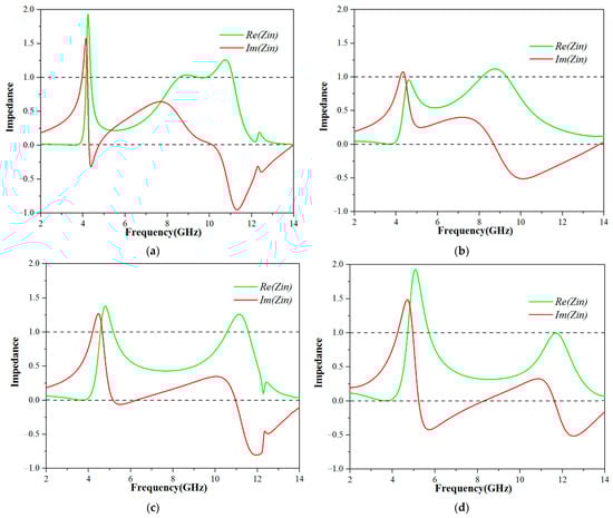 Normalized intrinsic impedance of proposed structure for different combinations: (a) R = 20 Ω, C = 0.25 pF; (b) R = 60 Ω, C = 0.01 pF; (c) R = 80 Ω, C = 0.15 pF; (d) R = 150 Ω, C = 0.1 pF.