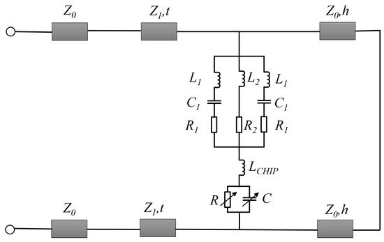 To validate the design’s effectiveness, an equivalent circuit model (ECM) of the proposed tunable absorber is introduced, as illustrated in Figure 7. The relative dielectric constant of the F4BME substrate is denoted as εr, with the substrate thickness as t and the air spacer thickness as h. The PIN diode is modeled as a parallel circuit with variable resistance (R) and capacitance (C), in series with an inductor (LCHIP). The elements L1 and R1 represent the distributed inductance and ohmic loss resistance of the semi-split elliptical ring, respectively, while L2 and R2 correspond to the distributed inductance and ohmic loss resistance of the middle strip of the unit. Each cell contains two gaps, with C1 representing the equivalent capacitance of one gap.