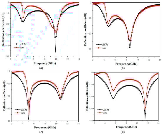 Comparisons between ECM results and simulation results. (a) R = 20 Ω, C = 0.25 pF; (b) R = 60 Ω, C = 0.01 pF; (c) R = 80 Ω, C = 0.15 pF; (d) R = 150 Ω, C = 0.1 pF.