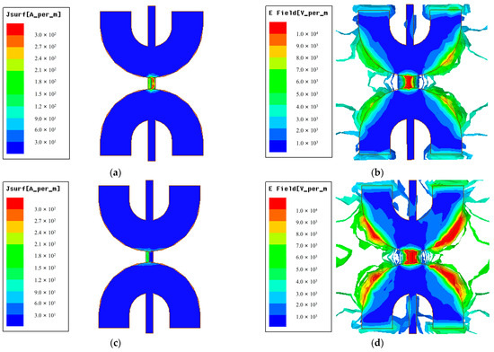 Surface current distribution and electric field distribution of the tunable FSS absorber. (a) Surface current distribution, R = 150 Ω and C = 0.1 pF; (b) electric field distribution, R = 150 Ω and C = 0.1 pF; (c) surface current distribution, R = 10 kΩ; (d) electric field distribution, R = 10 kΩ.