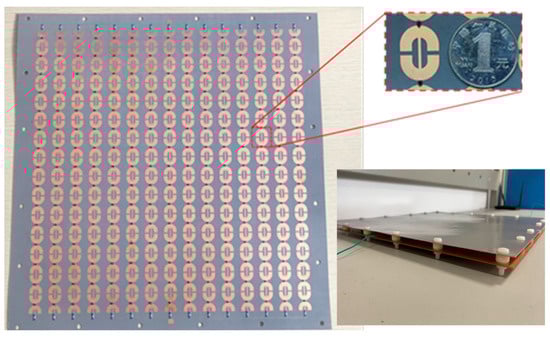 To implement the tunable absorber, a suitable bias net microwave anechoic chamber is essential. It must not only provide a stable bias voltage for the PIN diodes but also minimize any impact the network might have on the original structure’s response. The sample consists of an AFSS layer, a metal backplate, nylon washers, screws, and two bias wires. The overall dimensions of the structure are 361 mm × 357 mm, with the longer side due to the inclusion of the bias network. The AFSS layer comprises a 15 × 15 cell array, and the bias network, as shown in Figure 10, has a line width of 0.2 mm. In this configuration, each column of PIN diodes is connected in series, allowing for better control of the bias voltage and minimizing interference from unnecessary bias lines. EPCOS series inductors from TKD, with values of 1.8 nH, 2.7 nH, and 3.9 nH, are connected in series between the edge cells and the bias line to isolate high-frequency-induced currents from entering the bias network. PIN diodes are soldered in the middle of each unit. The air spacer is realized using nylon washers, which are free of electromagnetic interference.