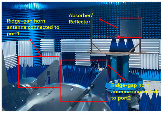 The testing environment, as shown in Figure 11, involves a pair of 1–18 GHz horn antennas connected to two ports of a vector network analyzer. One antenna serves as the transmitting antenna, while the other functions as the receiving antenna. Notably, the transmitting and receiving antennas are positioned adjacent to each other in the same vertical plane and at the same height. To minimize coupling interference, an absorbing material is placed between the two antennas. The test sample is positioned within an absorbing wall made of absorbing materials to reduce edge diffraction effects. The distance between the antennas and the test sample satisfies the far-field condition, and the centers of the antennas are aligned with the center of the test sample at the same height.