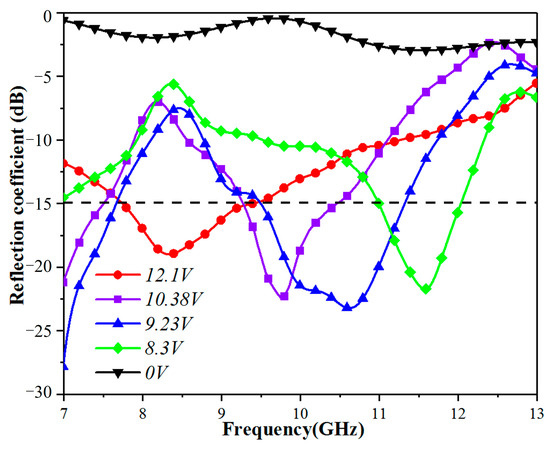 Figure 12 shows the reflection coefficients at various bias voltages for the tunable absorber with embedded PIN diodes. As the voltage increases, the resonance frequency decreases. For example, at 12.1 V, the reflection coefficient drops below −15 dB in the 7.7–9.4 GHz range, resembling the case with R = 60 Ω and C = 0.01 pF shown in Figure 3b. The simulation results (for R = 20 Ω, C = 0.25 pF; R = 80 Ω, C = 0.15 pF; and R = 150 Ω, C = 0.1 pF) align well with the measured data. At lower bias voltages, the reflection coefficients remain above −3 dB across the 7–13 GHz range, indicating a reflective state, whereas higher voltages lead to absorptive behavior in specific frequency bands. Minor variations in the reflection peaks around 8 GHz at different voltages suggest practical adjustments due to manufacturing conditions. These results confirm the device’s tunability and its ability to switch between reflective and absorptive states effectively.