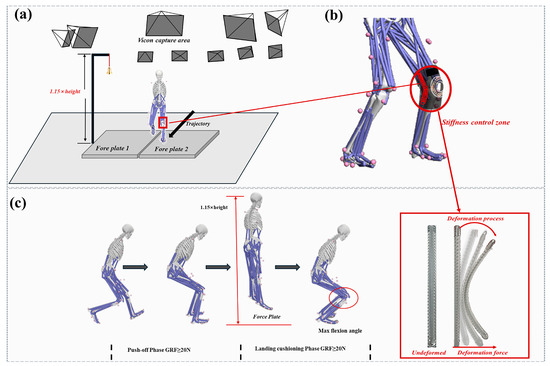 All experiments were conducted in the Sports Biomechanics Laboratory of the Institute of Grand Health, Ningbo University. Before the experiment, all subjects wore tight basketball shorts, and their height and weight were measured. The subjects were informed of the experimental process. The knee brace was worn in the order of no-stiffness, low-stiffness, and high-stiffness. The stiffness of the knee brace was adjusted using the flat springs built into the design. This brand of knee brace features four detachable springs (Figure 1b). When no stiffness is required, no springs are inserted; for low stiffness, two springs are used; and for high stiffness, all four springs are inserted. The springs were positioned in alignment with the wearing direction of the knee brace and provided support through controlled bending deformation. It was used to collect 38 reflective markers attached to the subject [22].