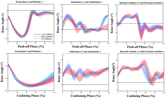 The kinematic analysis revealed that the knee joint was in a flexed position at the initial contact (IC) moment of the jump shot under all knee brace stiffness conditions. Significant differences in knee flexion angle were observed among the brace conditions (p = 0.001). Additionally, the knee adduction angle exhibited significant differences (p = 0.001), while no significant differences were found in the knee rotation angle (Table 2). When landing with no-stiffness knee braces, the knee joint experienced the maximum internal rotation angle, while wearing low-stiffness and high-stiffness knee braces results in smaller knee joint internal rotation angles compared to the no-stiffness condition. During the whole push-off phase, no significant differences were observed in the maximum knee flexion angle among knee braces with different stiffness levels. Similarly, there were no significant differences between low-stiffness and high-stiffness knee braces in terms of the maximum knee flexion angle or the maximum internal and external rotation angles. However, significant differences were found in the maximum knee flexion angles (p < 0.001), and the ROM of the knee in the sagittal, frontal, and horizontal planes was significantly different (p = 0.007, p = 0.001, p = 0.003) (Table 2).