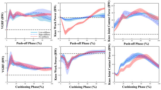 VGRF in two phases. And knee sagittal contact force and knee joint work power in the sagittal plane. The black dashed line represents a value of 0.