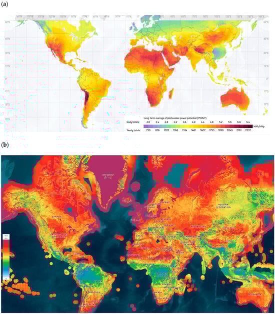 Color maps of the Earth’s natural resources: (a) Sun; (b) wind. (Based on the NASA POWER Data Access Viewer [30]).