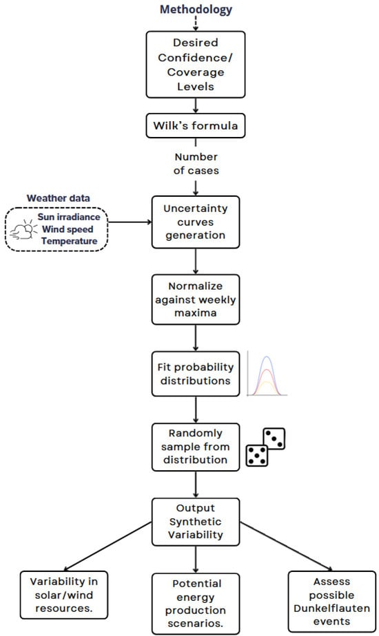 Figure 2 illustrates steps to create the synthetic wind, solar, and temperature hourly data. The approach employed follows the steps of Berna-Escriche et al. [39] and Álvarez-Piñeiro et al. [38]. Having in mind the considered confidence and coverage and the availability of climatic data, firstly, the PDFs that best fit the observed data are identified using hourly values recorded from 2001 to 2023.