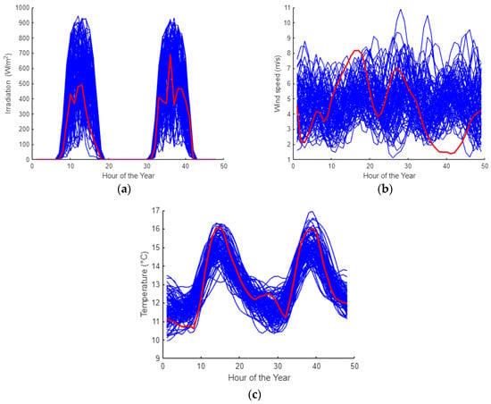 Extraction of two days generated (a) irradiance, (b) wind speed, and (c) synthetic curves for temperature. In red is one of the historical registered values (year 2001) for comparison.