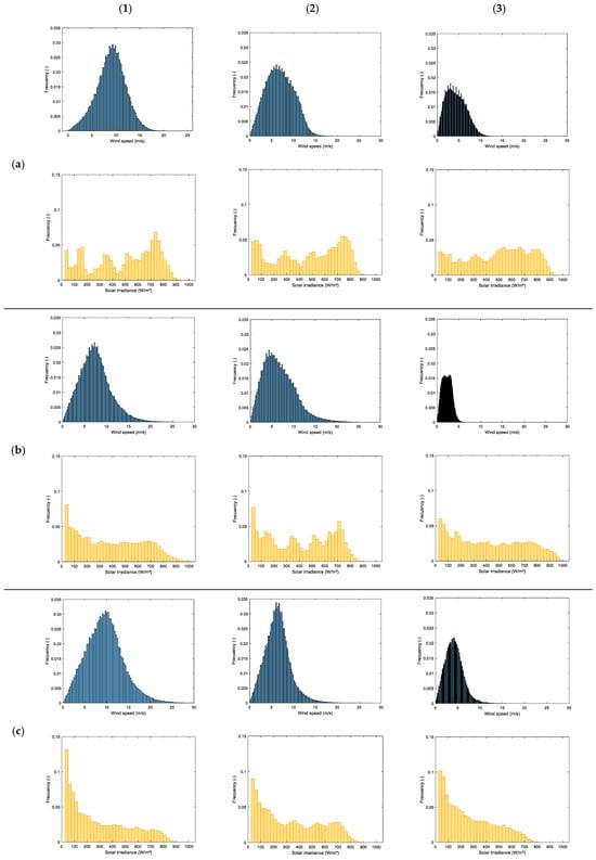 Histograms of the hourly wind and solar resources for the nine terrestrial locations considered, (a–c) solar irradiance: high, moderate and low; (1–3) wind speed: high, moderate, and low.