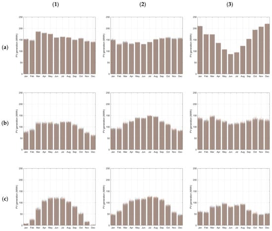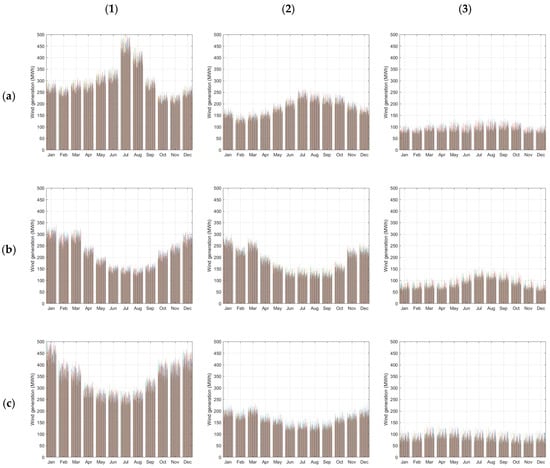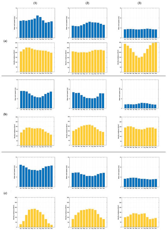 Monthly average values of the hourly wind and solar resources for the nine terrestrial locations considered: (a–c) solar irradiance: high, moderate, and low; (1–3) wind speed: high, moderate, and low.