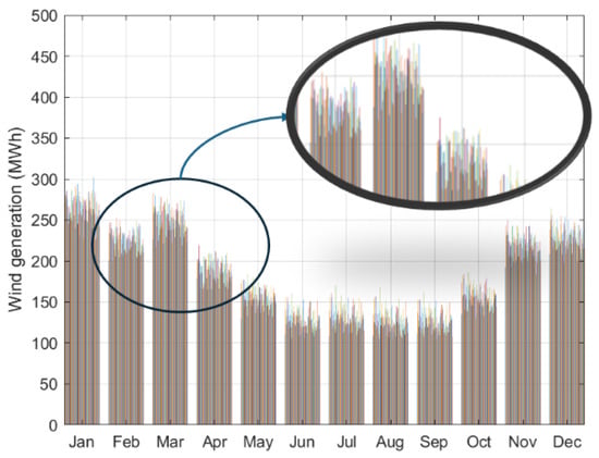 The wind generation is estimated with the previous equations and the uncertainty in its production is forwarded by the wind speed, as mentioned before with the crafting of synthetic wind speed curves and by the different constants (Table 3). Typical values for these constants are taken from Bustos et al. [50,51], and an uncertain range of ±10% is employed, allowing for deviations, atmospheric and working conditions, and other possible factors.