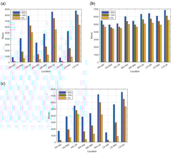 Consequently, the study of these low-generation zones is key in the design of generation mixes with strong contributions of renewable generation; therefore, these aspects are emphasized below. First, it is essential to determine the number of hours with low generation in each location. Figure 9 illustrates the annual hours with generation below the commonly used thresholds for low generation, i.e., 5%, 10%, and 20%. These values are shown for wind, solar, and the combined generation of both in the nine locations analyzed in this study.