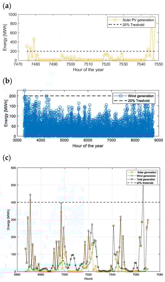 Yearly hours below generation threshold values of 5, 10, and 20% of peak power for the studied resources: (a) wind; (b) sun; (c) both contributions.
