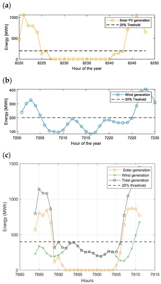 Low-generation periods (DF events) for a region with low radiation and winds: (a) solar PV; (b) wind; (c) both added.