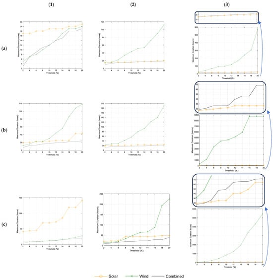 Duration of the maximum DF period as a function of the threshold value for the nine terrestrial locations considered: (a–c) solar irradiance: high, moderate, and low; (1–3) wind speed: high, moderate, and low.