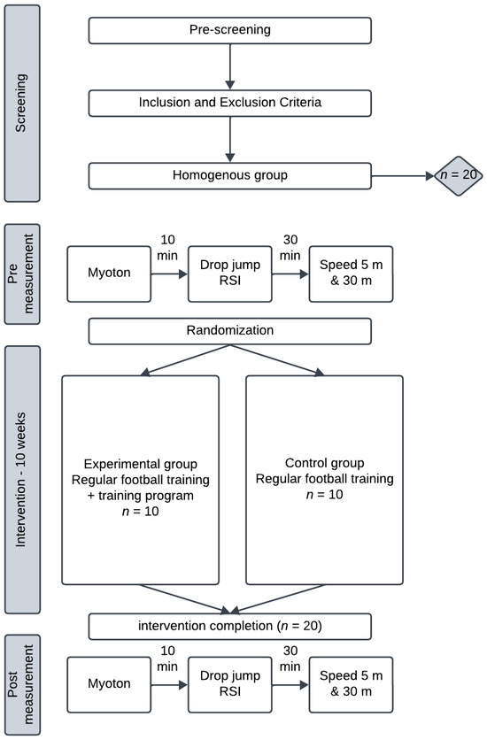 The study was designed as a prospective experimental study with a control group (Figure 1). The experimental group underwent a 10-week plyometric training program. In contrast, the control group did not undergo plyometric training and followed a standard football training program. The group assignment was done through simple 1:1 randomization with a random sequence using the website ranomizer.org. The group assignment was independent of the treatment time and the research staff. Each participant underwent an introductory intervention, plyometric training, receiving a 10-min briefing seven days before the study.
