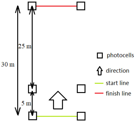 For sprint time measurements according to the “gold standard” [18], fully automatic photoelectric cells (Microgate Witty System, Bolzano, Italy, 2019) were used (Figure 2). According to various studies, a setup at intervals of 0 m, 5 m, and 30 m on a natural grass football field does not constitute a significant difference in measurements compared to hard surfaces [19,20] (Figure 3). Each athlete performed two trials at the maximum possible speed, with complete rest between trials. Previously, each athlete warmed up individually for about 10 min, where each ended the warm-up with a few faster sprints as a precaution before the upcoming test. All athletes were trained in the starting procedures, which are strictly standardized—a standing start and push-off from the more muscular trailing leg (Figure 4). The photoelectric cells measured the sprint time over two segments: the time for 5 m and the time for 30 m expressed in seconds.
