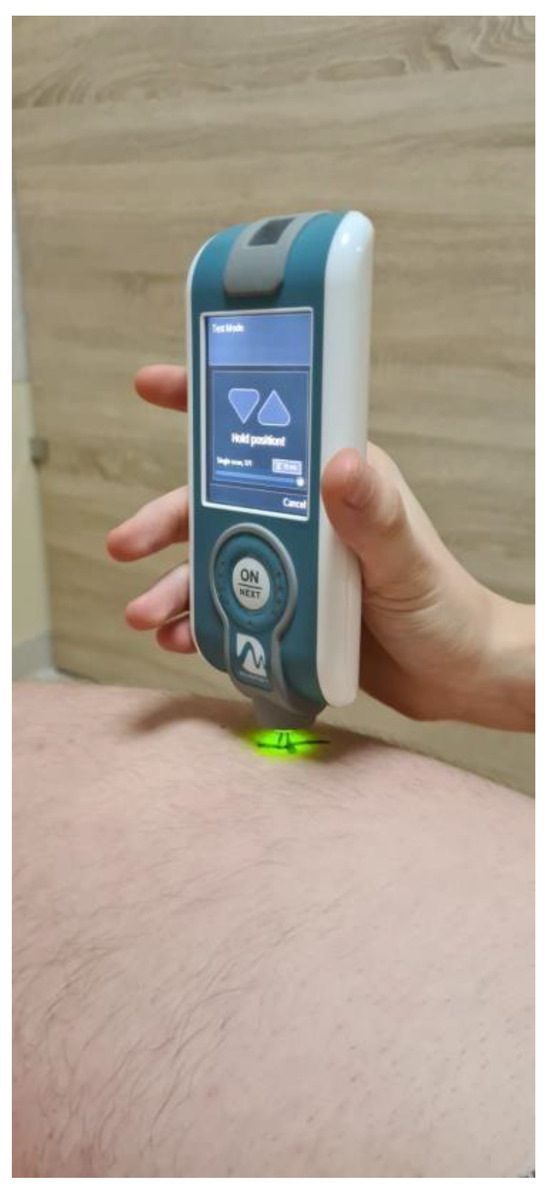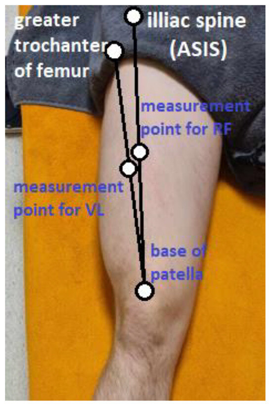 Biomechanical properties were measured using a myometer (MyotonPRO AS, Myoton Ltd., Tallinn, Estonia, 2021). Myoton is a digital device with a body and a deep probe (Ø 3 mm). An initial pressure (0.18 N) is applied to the surface through the probe, which causes the material underneath to compress. Next, the device releases a mechanical impulse (0.4 N, 15 ms) that temporarily deforms the medium. Myometry is a reliable measurement method and allows for the detection of differences in physical properties compared to stretched muscle fibers [22]. The measurement method involves recording the damped natural vibrations of soft biological tissue in the form of an acceleration signal and then simultaneously calculating the parameters of the stress state and biomechanical properties. Thanks to the device, we can assess, among other things, the state of resting muscle tone (F), which is defined as the suppressed EMG signal and dynamic stiffness (S). Stiffness assessed using myotonometry is based on the theory of free oscillations and results from the natural oscillations of tissues in response to brief mechanical exposure of the skin. Tissues can also regain their original shape after deformation. This property, measured in this study, is called elasticity (D). The greater the elasticity, the faster the tissue returns to its original shape. Measurements with the myotonometer were performed in a standardized, supine resting position. The myotonometer was applied perpendicularly to the tissue (Figure 6). The broadest cross-sectional area of the muscles was determined and marked, meaning that the measurement location for the rectus femoris muscle was the midpoint of the distance from the anterior superior iliac spine to the upper border of the patella. For the vastus lateralis muscle, the segment’s midpoint is from the patella’s upper edge to the greater trochanter [14,23] (Figure 7).
