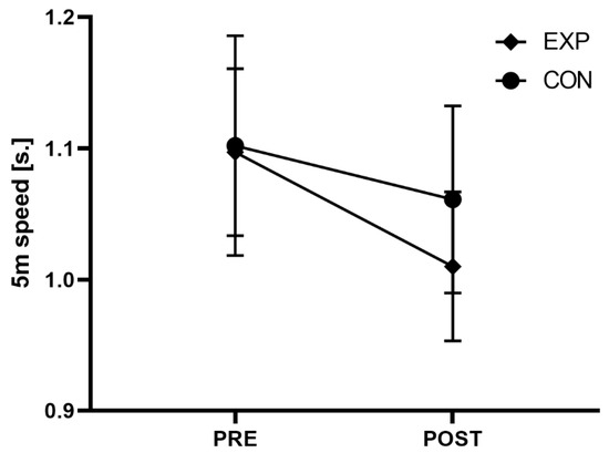 Significant differences were found for the main effects of the 5 m variable pre-post (F = 16.476; p < 0.01; ƞ2 = 0.47). In contrast, no significant differences were found for the group effect (F = 1.090; p > 0.05) and the higher-order pre-post*group interaction (F = 2.128; p > 0.05). To determine which groups had significant differences, further analyses were conducted using Bonferroni’s post-hoc multiple comparison tests. Significant differences were found in the 5 m [s.] variable after and before the intervention in the experimental group (p < 0.01; df = −0.087 (−8.6%); ES = 1.44). These results are supported by the data presented in Figure 8.