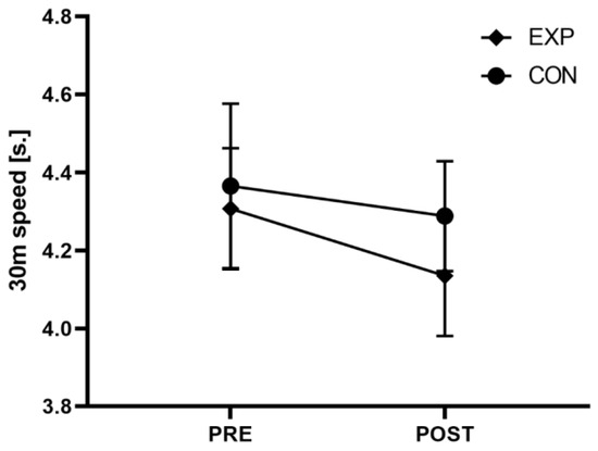 Significant differences were found for the main effects of the 30 m variable pre-post (F = 37.81; p < 0.01; ƞ2 = 0.67). In contrast, no significant differences were found for the effect group (F = 2.14; p > 0.05). However, for the interaction group*pre-post, analysis of variance allowed us to reject the null hypothesis of no difference (F = 5.5; p < 0.05; ƞ2 = 0.23). There was a significant difference in the 30m variable after and before the intervention in the experimental group (p < 0.01; df = −0.1720 (−4.15%); ES = 1.11) after applying Bonferroni post-hoc multiple comparison tests. These findings are further supported by the data illustrated in the accompanying Figure 9.