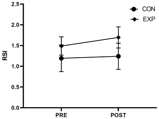 Analysis of the dependent variable RSI results showed significant differences for the group (F = 10.15; p < 0.01, ƞ2 = 0.36) and pre-post (F = 8.58; p < 0.01; ƞ2 = 0.32) factors. There were no significant differences in the group*post-pre interaction (F = 3.33; p < 0.01). There was a significant difference in the RSI variable after and before the intervention in the experimental group (p < 0.05; df = 0.2070 (14.3%); ES = 0.87) after using Bonferroni’s post-hoc multiple comparison tests. These findings are further supported by the data illustrated in the accompanying Figure 10.