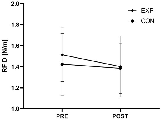 Significant differences were found for the main effects of the RF elasticity (D) variable pre-post (F = 11.76; p < 0.01; ƞ2 = 0.39). In contrast, no significant differences were found for the effect group (F = 2.43; p > 0.05). and for the group*pre-post (F = 0.35; p > 0.05;). However, there were no significant differences after applying post-hoc comparisons (p > 0.05). These results are supported by the data presented in Figure 11.