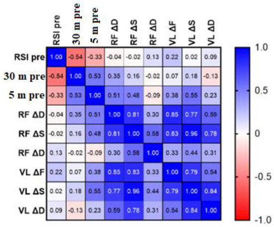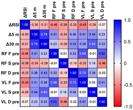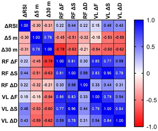 Correlation analysis revealed a statistically significant moderate positive correlation between VL D pre and Δ5 m variable (r = 0.65; p < 0.05). A statistically significant, strong negative correlation exists between RF ΔD and Δ5 m variables (r = −0.78; p = 0.01).