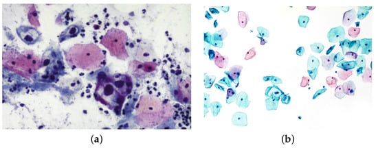 George N. Papanicolaou played a crucial role in the development of cytological diagnostics, who, in 1941, described the usage of a vaginal smear in the diagnosis of uterine carcinoma [] and in 1942 introduced a new staining procedure for these smears []. These advances have brought substantial improvements in cytological examinations, mainly by identifying atypical cells in smears. This technique, named after its creator, is now universally recognized as the Pap smear. Building on these basic techniques, the Bethesda system was established as a uniform method of reporting cervical and vaginal cytology findings. Having been revised on multiple occasions since its invention, it continues to facilitate efficient communication and handling of cervical cytological irregularities. In 2012, Solomon and Kurman described the Bethesda system (TBS) that details definitions, criteria, and terminological clarifications []. The TBS format is adaptable and designed to integrate both evolving diagnostic approaches for cervical cancer and advances in cervical pathology. This system employs a two-level reporting structure based on the condition of uterine cervix cells, which can be categorized into two distinct cases: