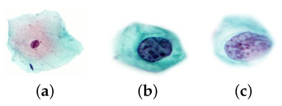 In this paper, we use images from liquid-based cytology (LBC), which is the latest advancement in cytological examination techniques. Liquid-based cytology is becoming more popular than traditional cytology as it reduces variability in sample preparation and improves the quality of diagnostic slides []. Unlike the conventional smear method, LBC involves suspending cells in a liquid medium before processing them on a glass slide, resulting in cleaner and more uniform preparations (see Figure 1).