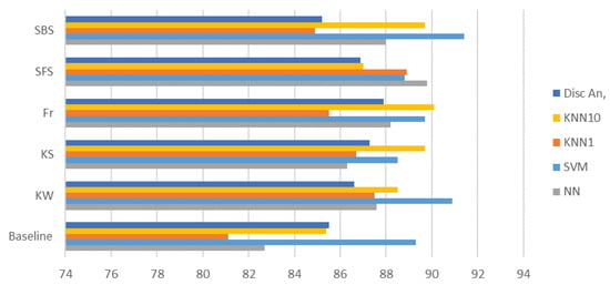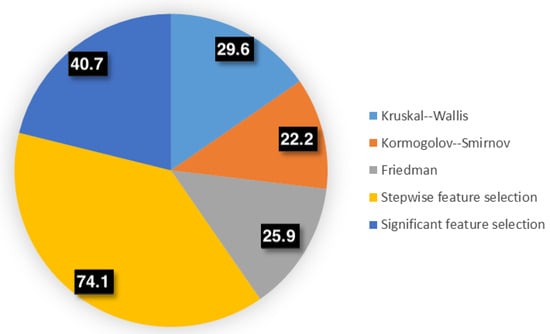 - Stepwise Feature SelectionThis is an iterative approach that adds or removes features to maximize classification performance. Given a set of extracted features, the stepwise feature selection method (SFS) chooses a subset of features that provide the best performance. The method performs a forward feature selection that in an iterative way adds the best features to the subset of selected features. In every iteration, the best prediction features are used and their significance is estimated with the F-test (see []). Here, we use the backward version of this algorithm (SBS), where the assumption is made that initially all features of the original feature set are used. At each iteration, the features with the worst prediction are eliminated.