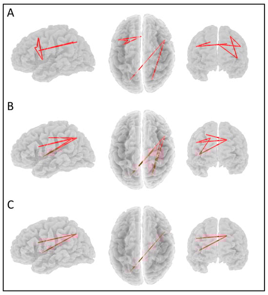 Significant positive correlations (p < 0.1) between theta coherence and the (A) Anhedonic depression scores, (B) Cognitive depression scores, and (C) overall MDD depression scores. Views are from the left, top, and front, respectively.