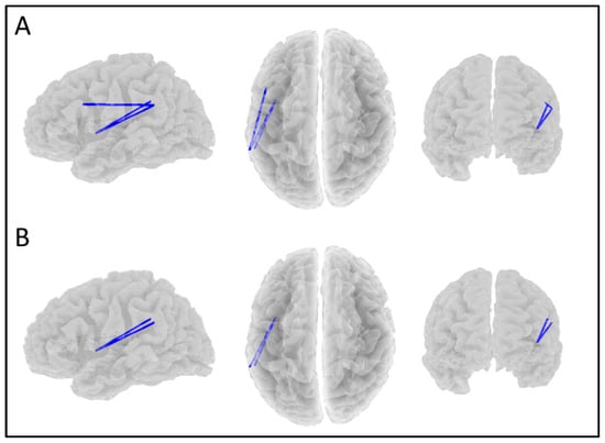 Significant negative correlations (p < 0.1) between beta coherence and (A) the Cognitive depression scores and (B) both the overall MDD depression scores and Anhedonic depression scores. Views are from the left, top, and front, respectively.