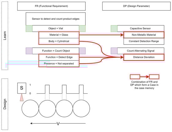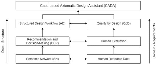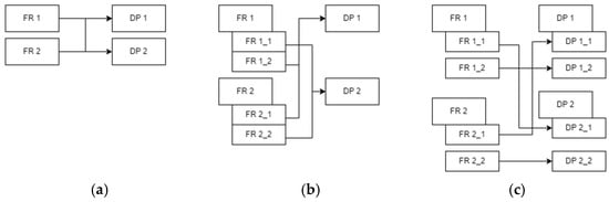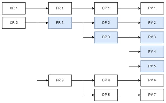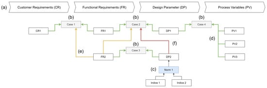 Axiomatic Design (AD) is well-known for its applicability and effectiveness in systematically analyzing a system and its requirements [,,]. According to Suh [], the inventor of AD, the workflow includes direct linkage of Customer Requirements (CR) to design objectives (Functional Requirements, FR) and design approaches (Design Parameters, DP) to build a problem-to-solution relationship. The fourth and last domain is Process Variables (PV). The framework has no built-in capability to keep the rationale behind the solution or other meta information that helps to understand the decision-making process inside the design matrix [].