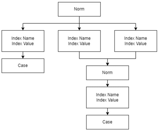 Every GE has three components, namely norms, indices, and cases. Norms hold general information as the root node of an information cluster to characterize the following content. Indices build sub-nodes of a Norm in a more specific description (Figure 3). An index consists of two parts, the index name and index value, which can also be considered a search term and response (e.g., hair color = brown). These key–value pairs act as a condition to distinguish between different Cases. The Case Node keeps the information needed to form the problem solution statements. If different indices point to the same case, a new Layer is introduced as a new Norm holding its indices and cases [,,].