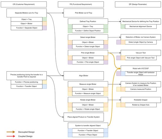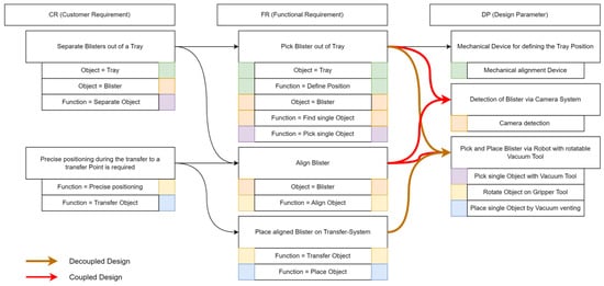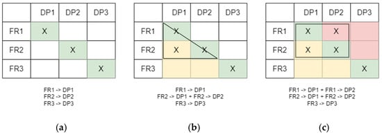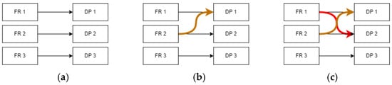 The design process is carried out iteratively through the “zigzagging” process between the FR and DP. This method creates a table (Design Matrix, see Figure 5) that offers the possibility of evaluating the design concept. In the best case, the Design is “uncoupled”, meaning there are only one-on-one relationships between FR and DP, which results in a diagonal matrix. Also acceptable is the “decoupled” scenario where the design matrix is triangular. Design concepts that are “coupled” indicate non-acceptable solutions. This can result from situations where not all FR are connected to at least one DP or a violation of the Independence Axiom [,].