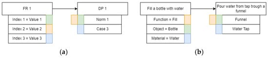 The relation between the CR or FR and DP can be described through the terms used in CBR. An FR is a short paragraph containing information about selecting the DP. Our design assistant proposes a method to split the textual requirement description into a set of key–value pairs following the concept of indices from CBR. These indices form the condition or selector for the individual Case or Norm, equal to the DP in our implementation. Figure 9 shows the method with the terms used in CBR (a.) and an implementation (b.) example. The color code helps the Designer avoid becoming confused with other indicators like the arrows for the AD matrix representation.