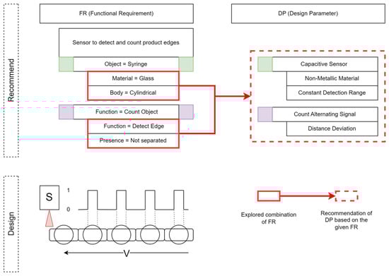 If viable solutions exist, AD supports the decision-making process through the Information Axiom, which states that the best solution is the one that needs the least information to be described. Following this concept, designers strive for simplicity. This principle has the potential to be cost-effective and quality-relevant at the same time []. The definition of AD elements (CR, FR, DP, and PV) is very weak to keep it open for various design problems. In other words, a DP can be a system, equipment, function, or variable. This comes with the need for a clear definition available to all designers involved in the solution-finding process. A clear abstraction guideline that keeps the layer definition (what is the definition of a System, Equipment, …) is thus interchangeable information throughout different design problems and stakeholders []. Such a definition is crucial to support the reuse of knowledge in the context of Ontology and Epistemology. To incorporate previously designed solutions for similar problems into a new design process is an overall performance improvement of the design process. The same reasons apply to the support of data-driven design [].