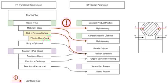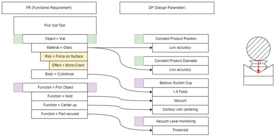 This research discussed a specific design method covering the needs of a domain belonging to the pharmaceutical engineering environment. Design methods in this section need to be better represented in the design community. Our proposed method combines well-established tools and modern data architecture. The positive effect of the domains and the workflow coming with AD is also recognized in a combination of AD and TRIZ []. A combination of different tools like TRIZ and PSN still needs detailed instructions on how to translate the problem into a solution in a compliant way []. In our case, AD incorporates this method, and thus, the Designer benefits from the guidance through the domains of a structured approach within AD.