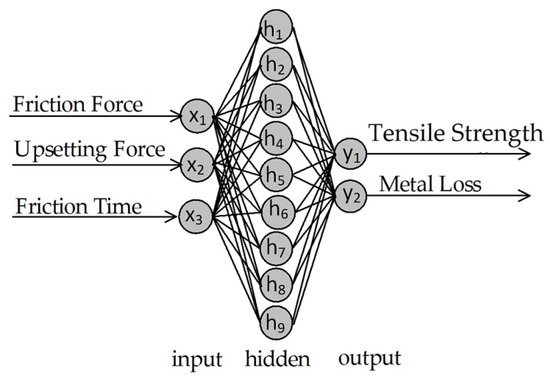 The neural network architecture was studied for twelve different cases based on previous literature. To find the best relations between the inputs (friction force, friction time and upsetting force) and outputs (tensile strength and metal loss), different activation functions and different numbers of neurons in the hidden layer were tested (see Table 6). The number of hidden nodes in a network is especially critical to network performance [27]. The effectiveness of the model was measured using the mean square error of validation samples (MSE valid.) and the correlation coefficient (R-value).