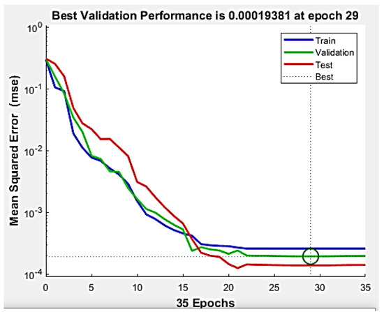 The best fit was obtained after 29 epochs, for which the smallest MSE error was 0.00019381. The low value of the mean squared error indicates that the neural network model developed will provide good predictions.