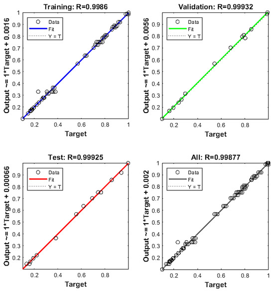 Figure 6 shows the results of the correlation coefficient R for the training, test, validation and total sets. The values for these sets are 0.9986, 0.9993, 0.9992 and 0.998, respectively. These values are close to 1; hence, it can be concluded that the neural network has been well-modelled and can be used to optimise the process parameters [47].