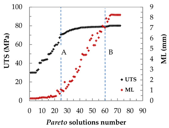 The Pareto curve of UTS and ML using genetic algorithms is presented in Figure 7.